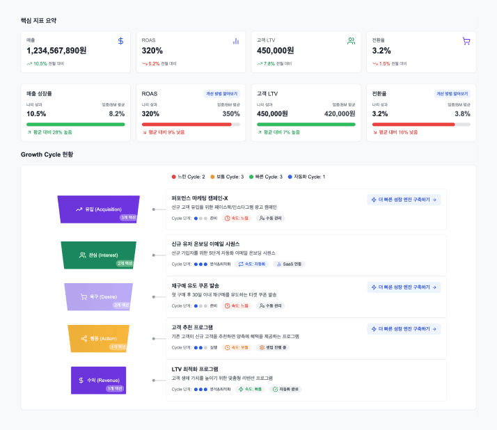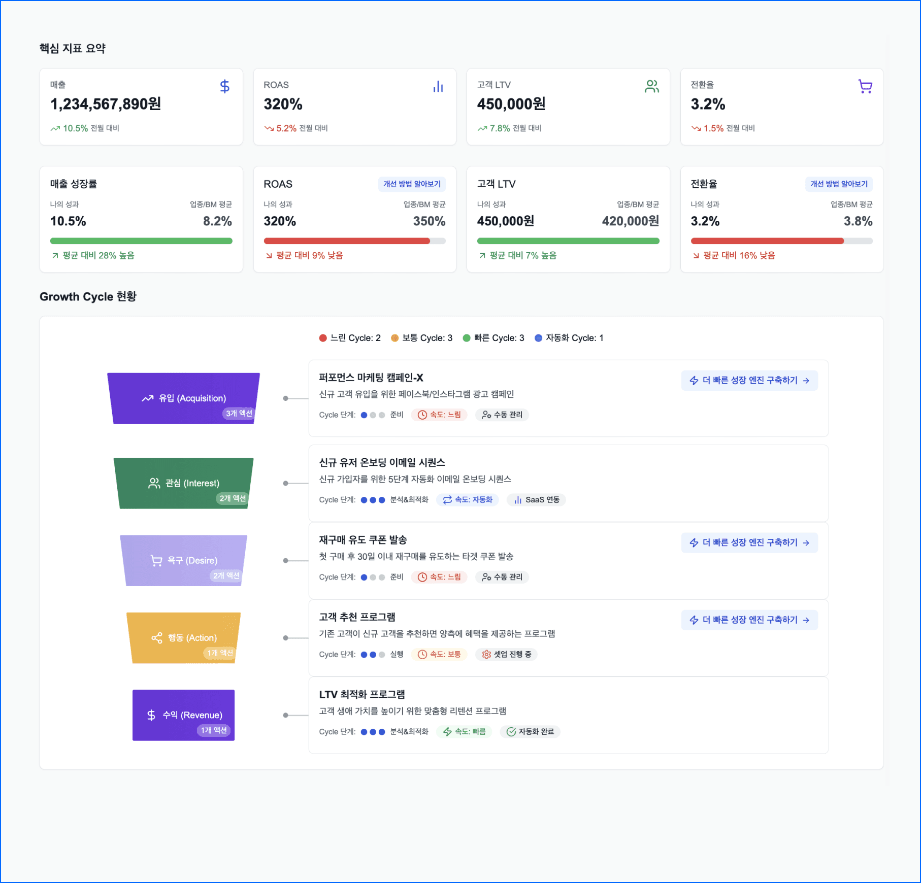 한 눈에 보이는 매출 · ROAS · LTV, 퍼널별 액션까지. 의사결정 3배 빨라집니다.